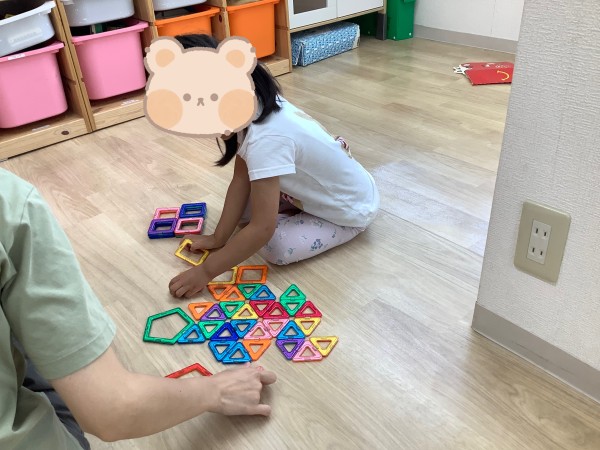 ピースが磁石でくっつく玩具で遊んでいる様子です。