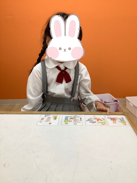 ストーリーの場面を描いた四枚のカードを並べていく課題です。