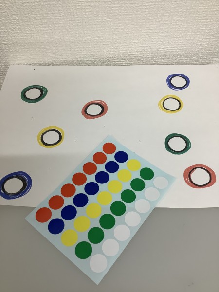 〇の周りについている色と同じ色のシールを貼ってもらいます。