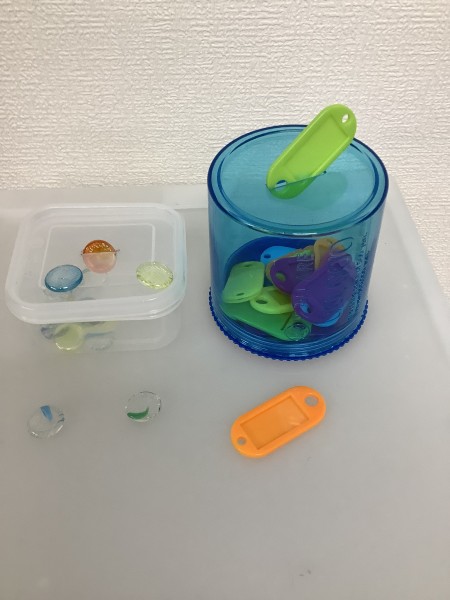 穴にビー玉やコイン、棒等色々な物を入れて落とします。